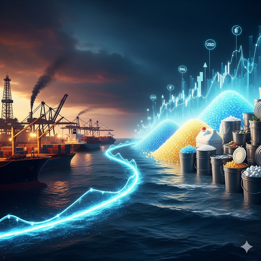 Como consequência, produtos derivados da cadeia petroquímica — como polietileno (PE), polipropileno (PP) e PET — sofrem impacto direto, pressionando as margens de empresas que dependem dessas matérias-primas.
